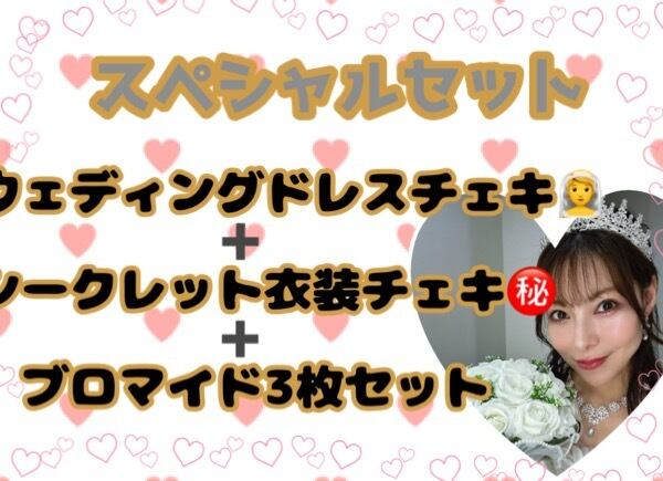 ウェディングドレスチェキ1枚、シークレット衣装チェキ1枚、ブロマイド3枚セットになります!